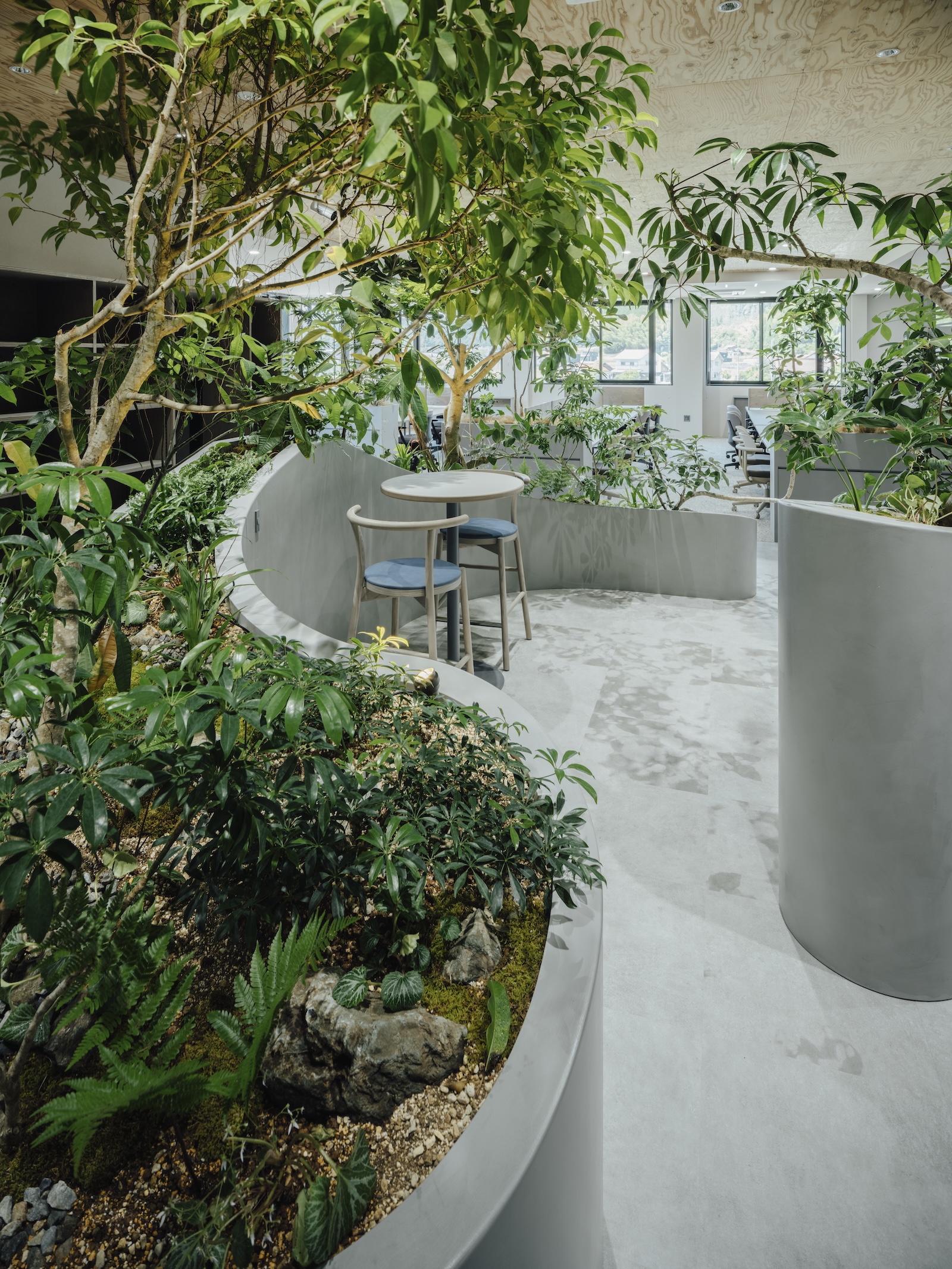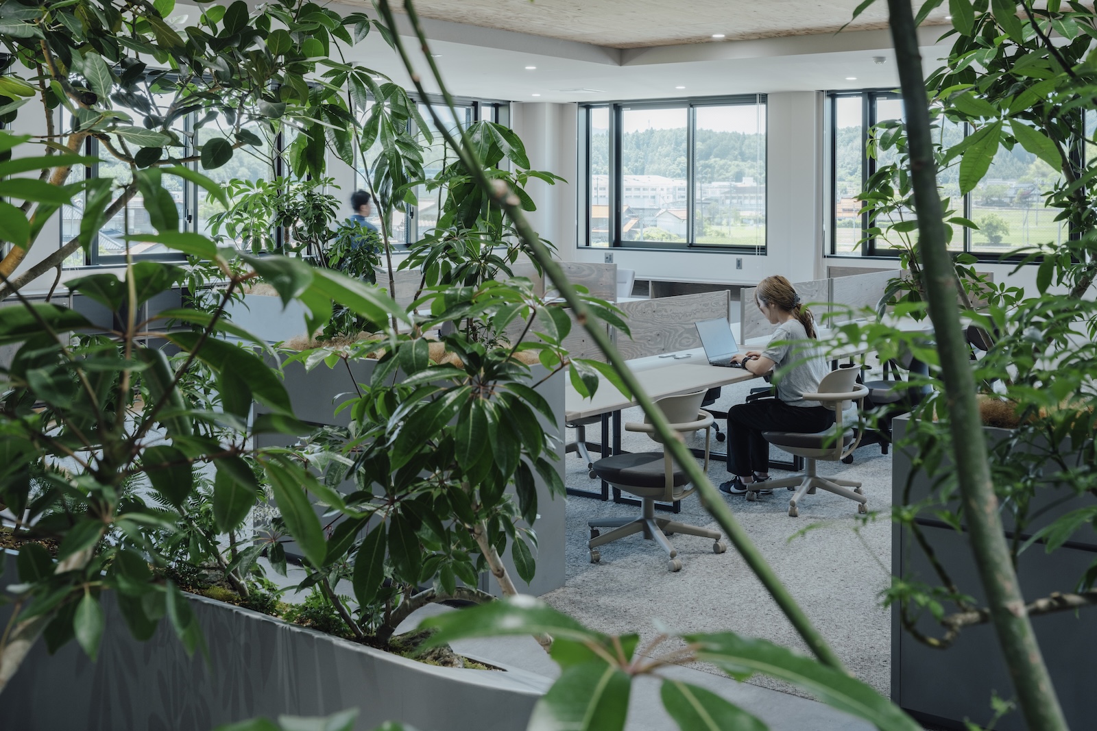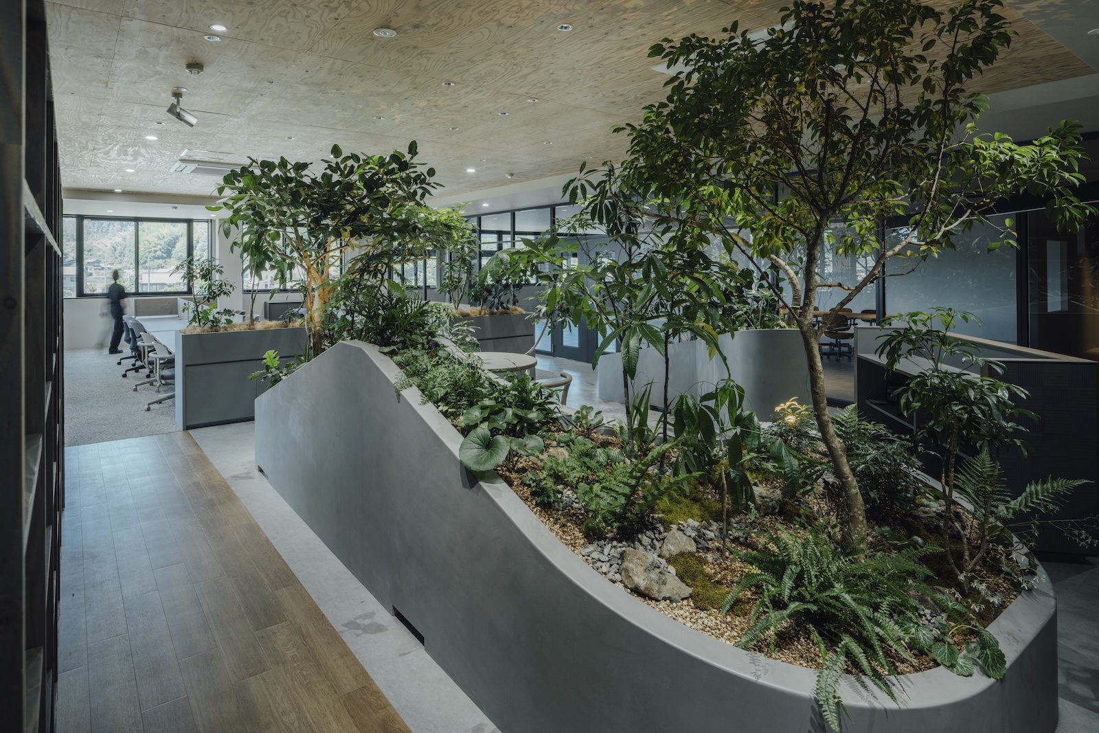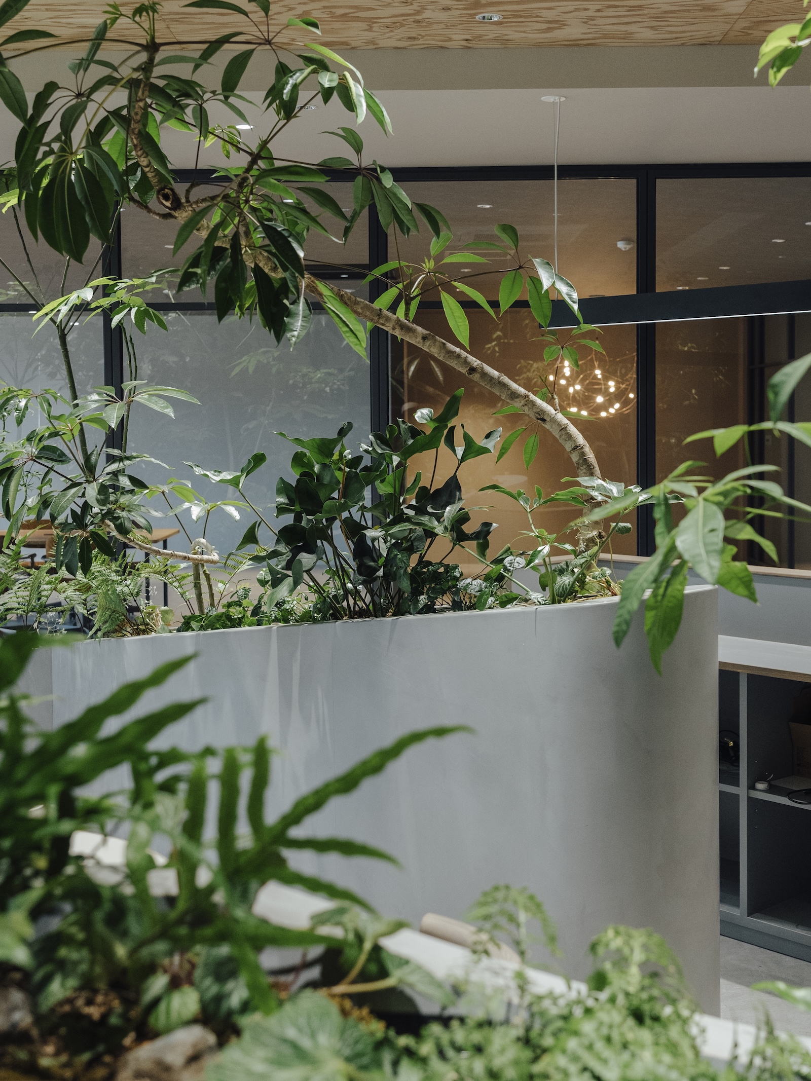 経営者の「挑戦と行動で眠りを変え、世界を変える」というビジョンを受け、広島のものづくりを世界へとつなげるためのコンセプトオフィスとしてデザイン。豊かな自然とものづくりの文化をもつ千代田町のマインドを表現し、室内に有機的なデザインの大きなプランターを設置する。ニュートラルな玄関エントランス、森に囲まれクリエイティブな気持ちになれるミーティングスペース、世界と千代田町を結ぶグラフィックと赤をメインカラーとした商談スペースなど、会社の持つ個性と挑戦をインテリアに表現した。