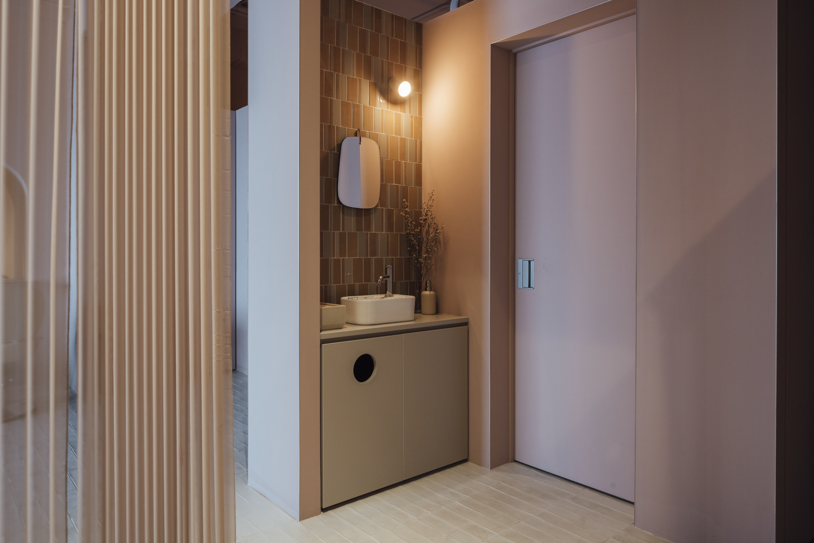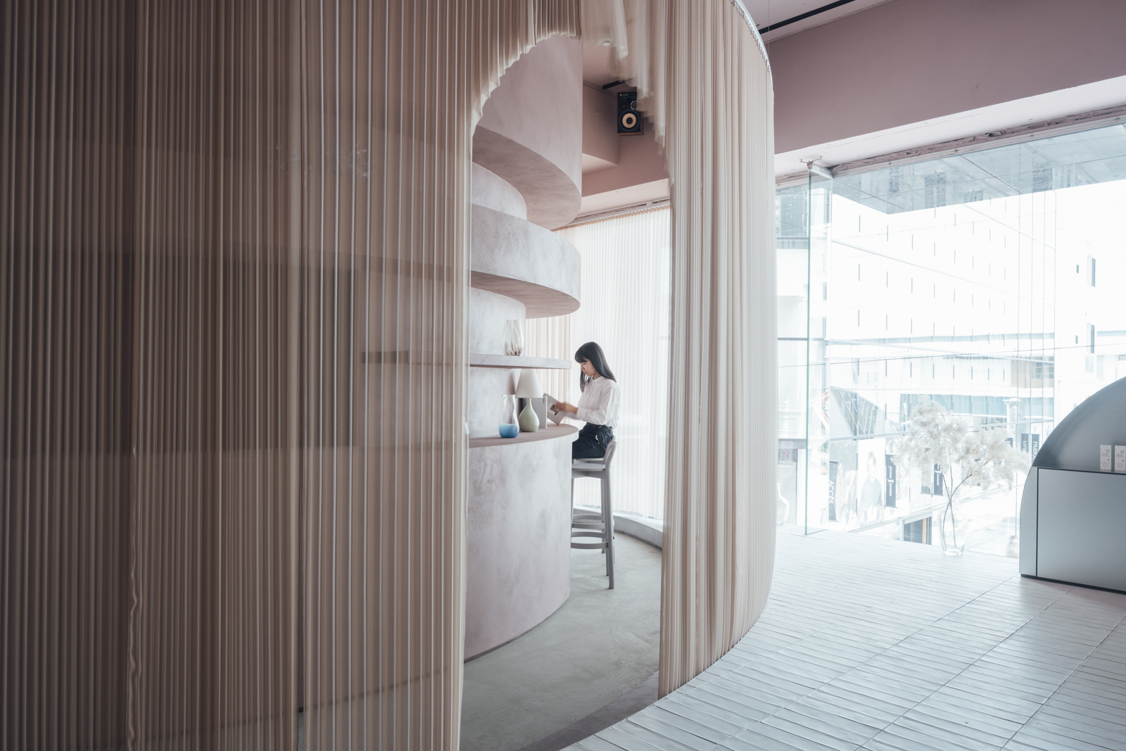 曲線を用いた什器デザインや、美しい色の布を円形のカウンターに巻き付け、包み込まれたような癒しと期待感をもたせている。