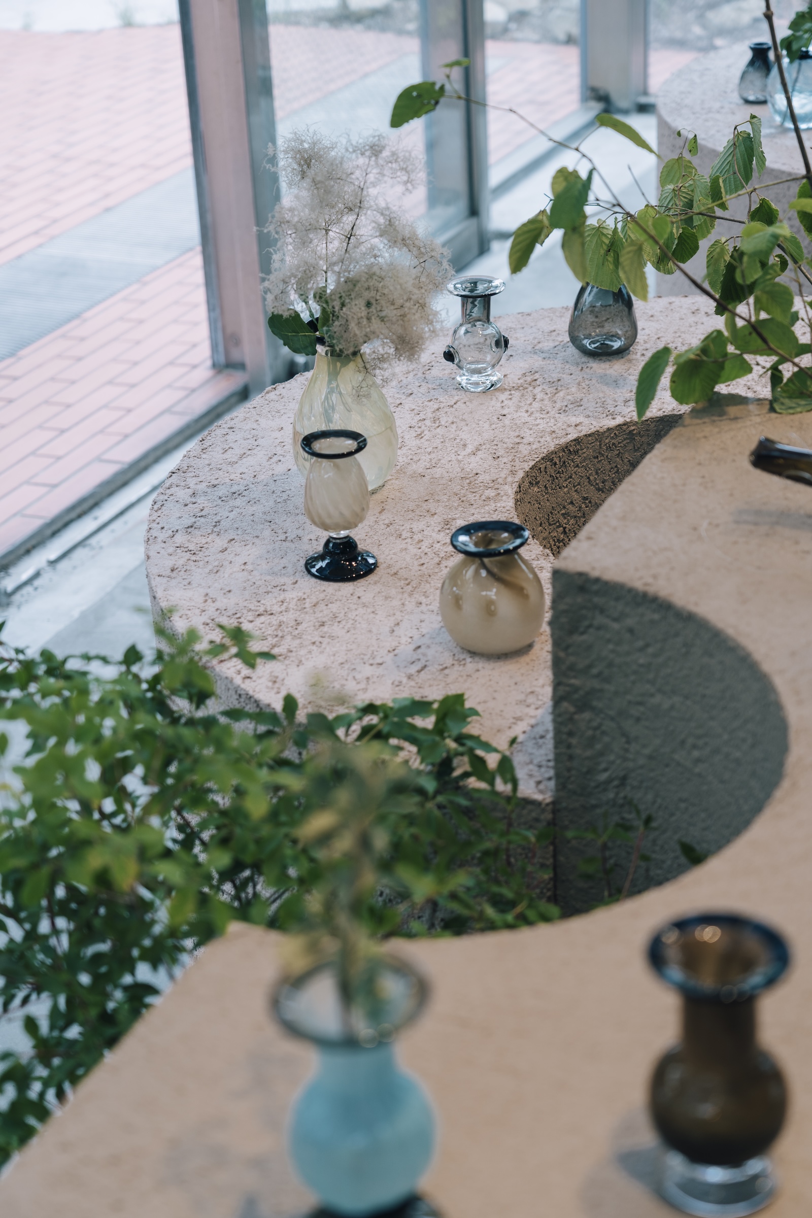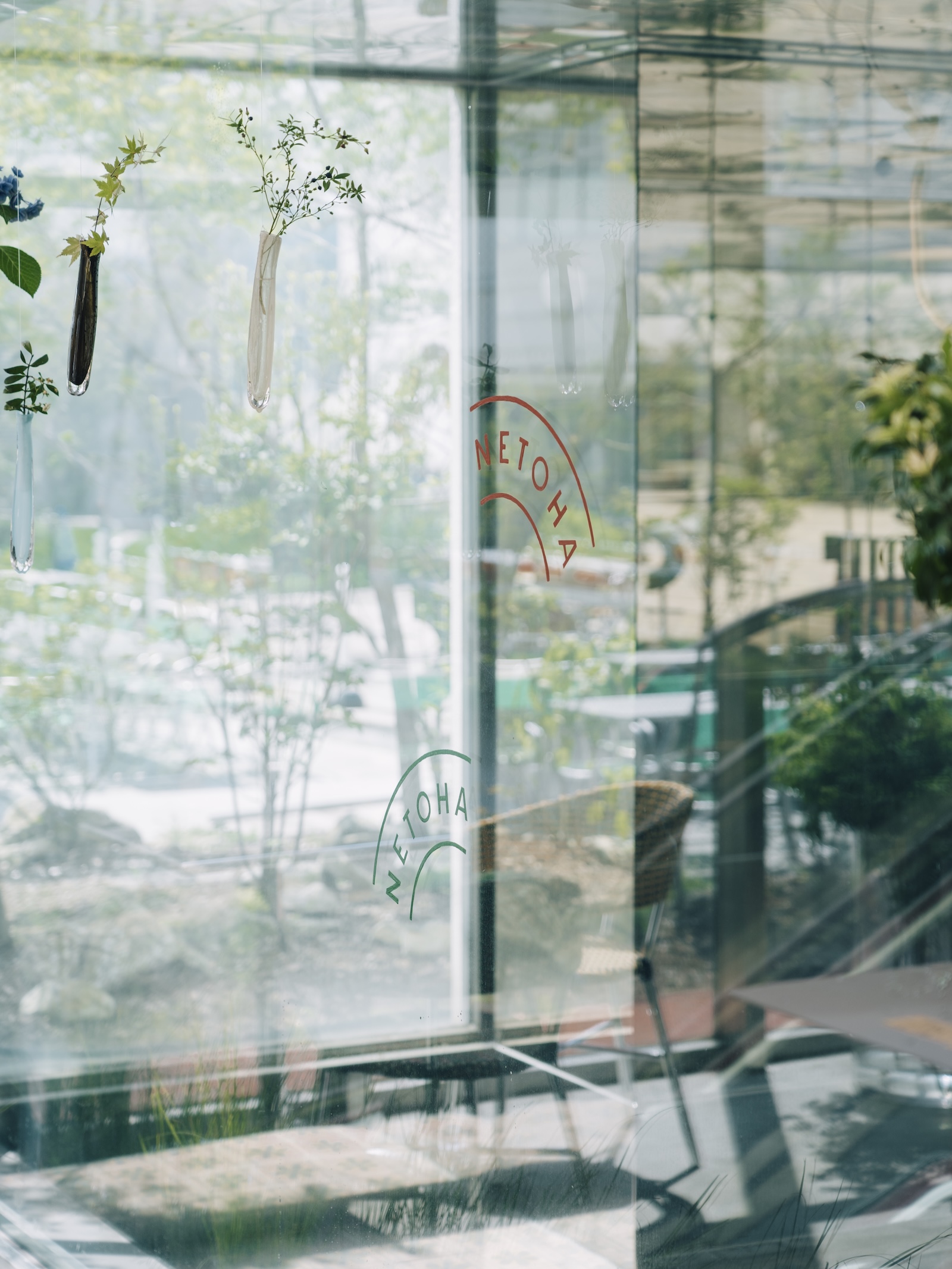 小さなサンルームのような空間の中に、ロゴと同じ形のU字の什器を配置し、かわいらしい花と枝、作家の作った一輪挿しを並べてディスプレイ。